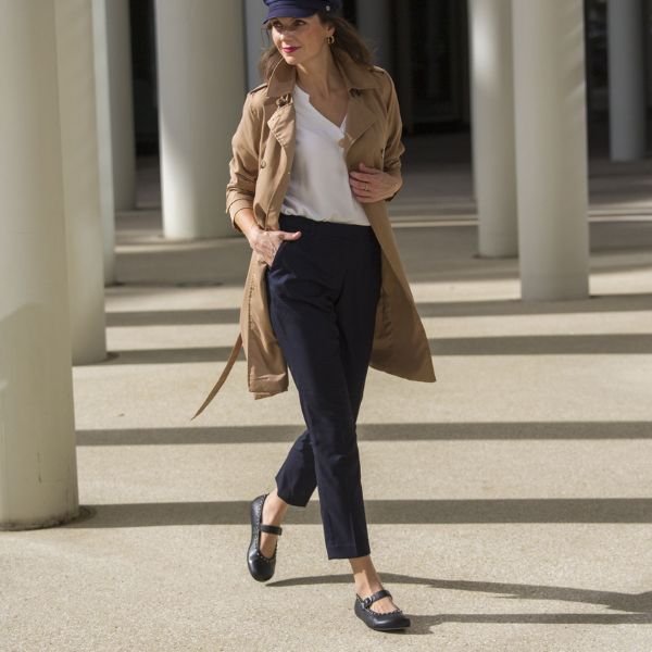 Unsere Kundin Ria hat nach zwei Fuß-OPs einen bequemen Ballerina-Barfußschuh gefunden, den sie stilvoll zu Hosen und Röcken tragen kann.