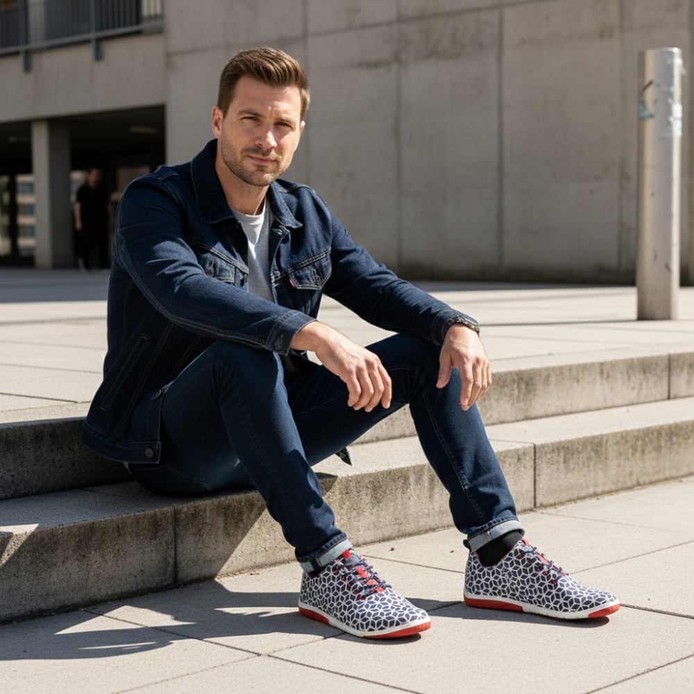 Für diesen Sneaker verwenden wir graublaues Premium Nappaleder, welches mit einem Netz aus hellgrauer Microfaser überzogen ist. Dadurch entsteht dieses einzigartige Muster. Mit den roten Akzenten im Bereich der Schnürung und der Sohle entsteht ein stimmiges Gesamtbild.