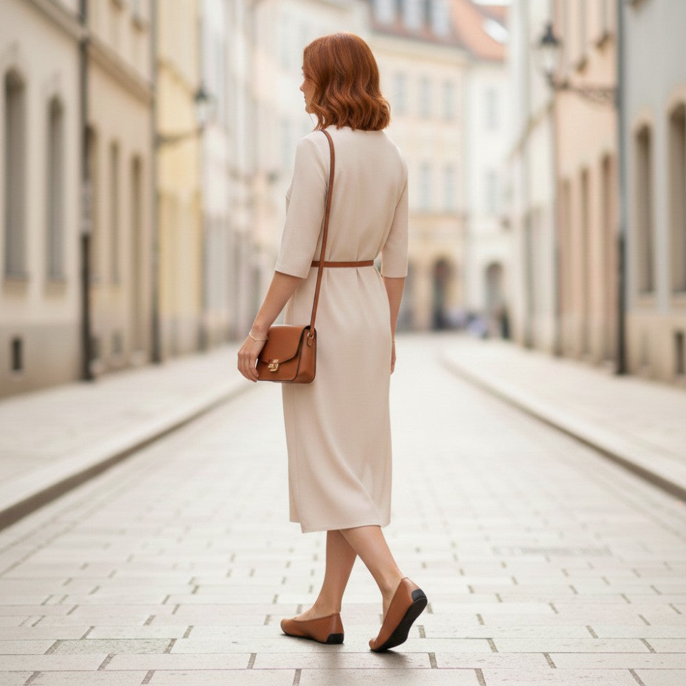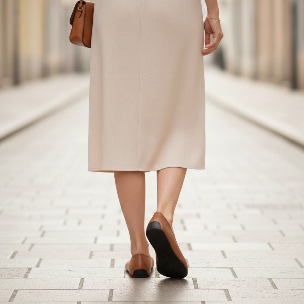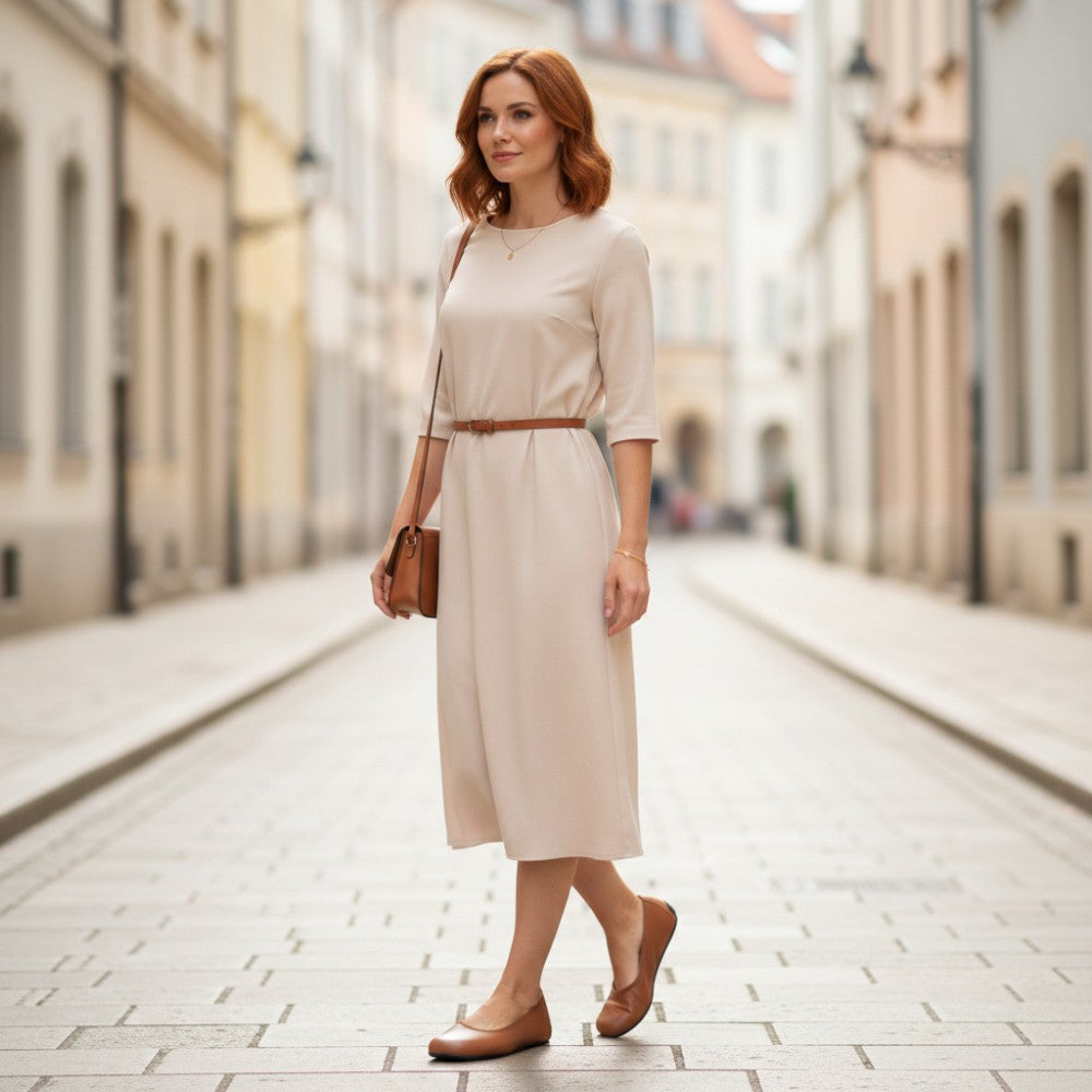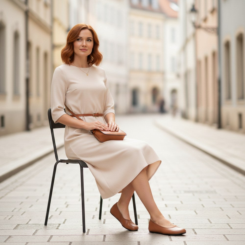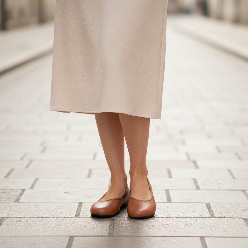 Du suchst einen simplen Ballerina, der feminin aussieht und aus 100% veganen Materialien gefertigt wurde? Hier ist er, unser QARMA Vegan Cognac.