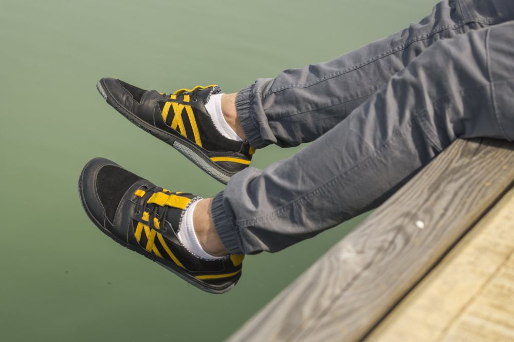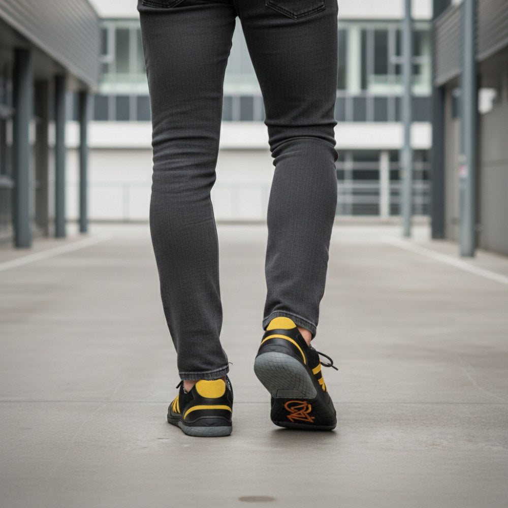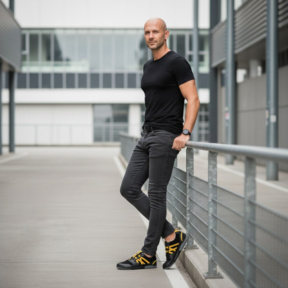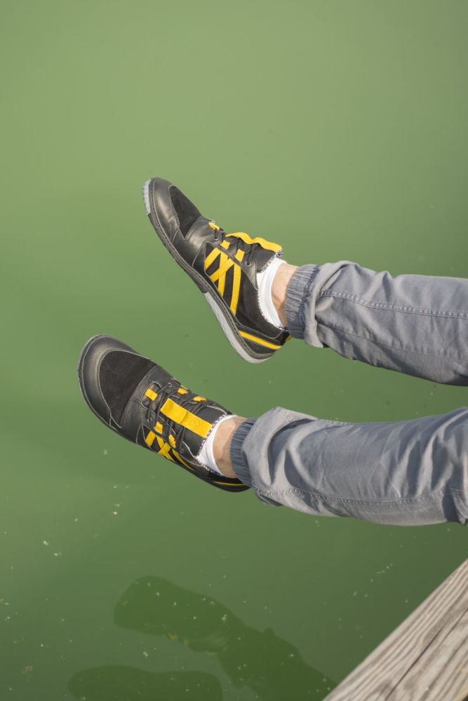 Für diesen Barfußschuh haben wir schwarzes Velours- und Nappaleder der höchsten Qualität vernäht und mit knallgelben Streifen versehen. Damit entsteht ein sportlich-dynamischer Look, der perfekt zu allen Freizeitoutfits passt.