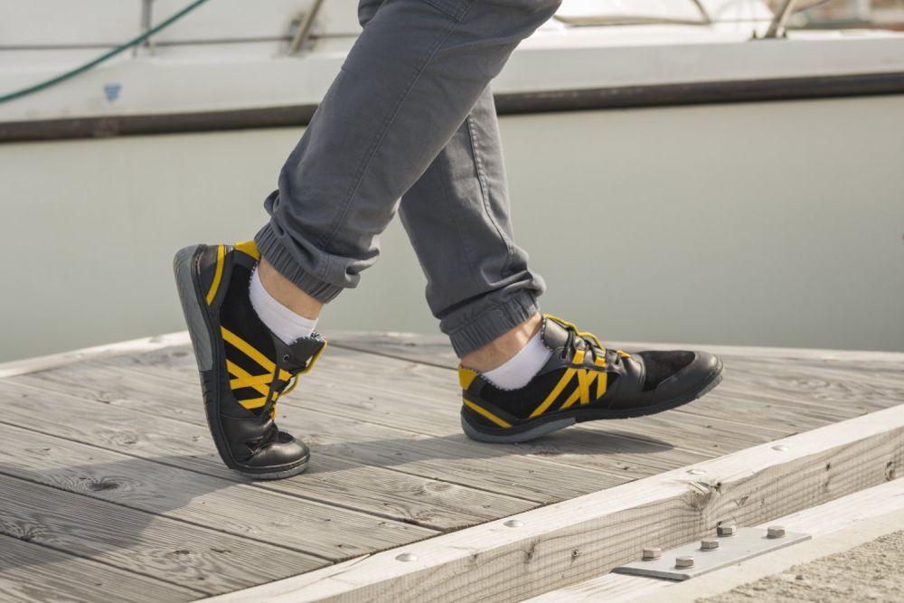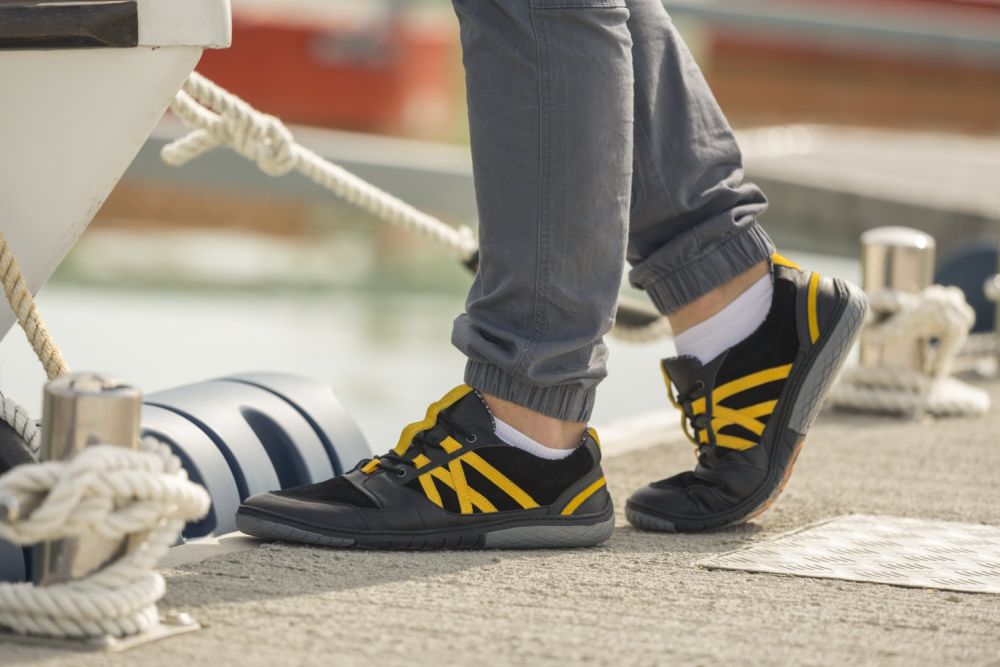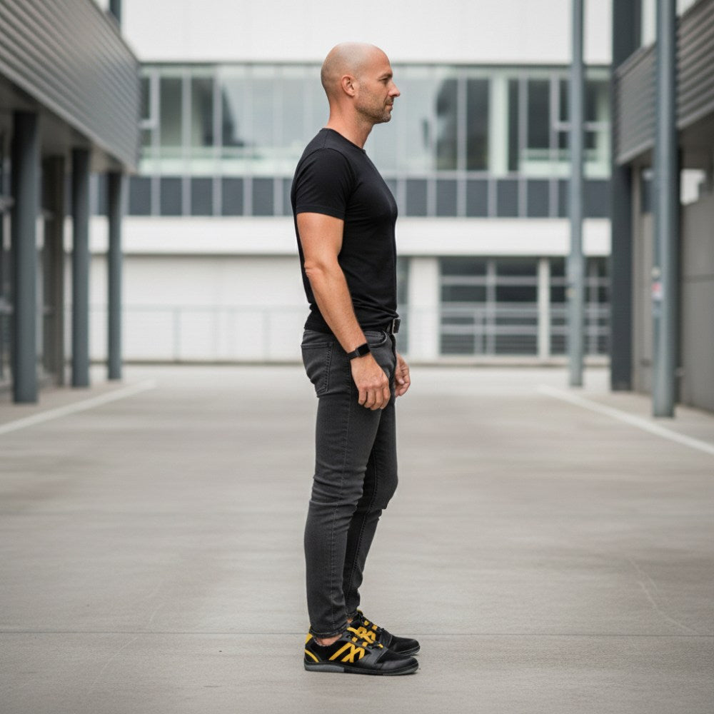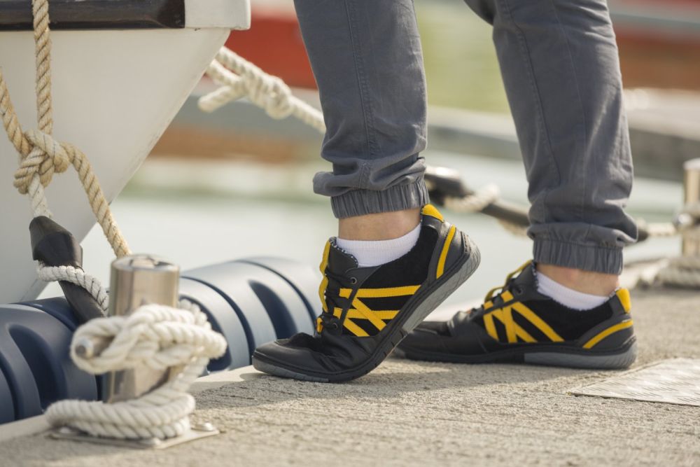 Für diesen Barfußschuh haben wir schwarzes Velours- und Nappaleder der höchsten Qualität vernäht und mit knallgelben Streifen versehen. Damit entsteht ein sportlich-dynamischer Look, der perfekt zu allen Freizeitoutfits passt.