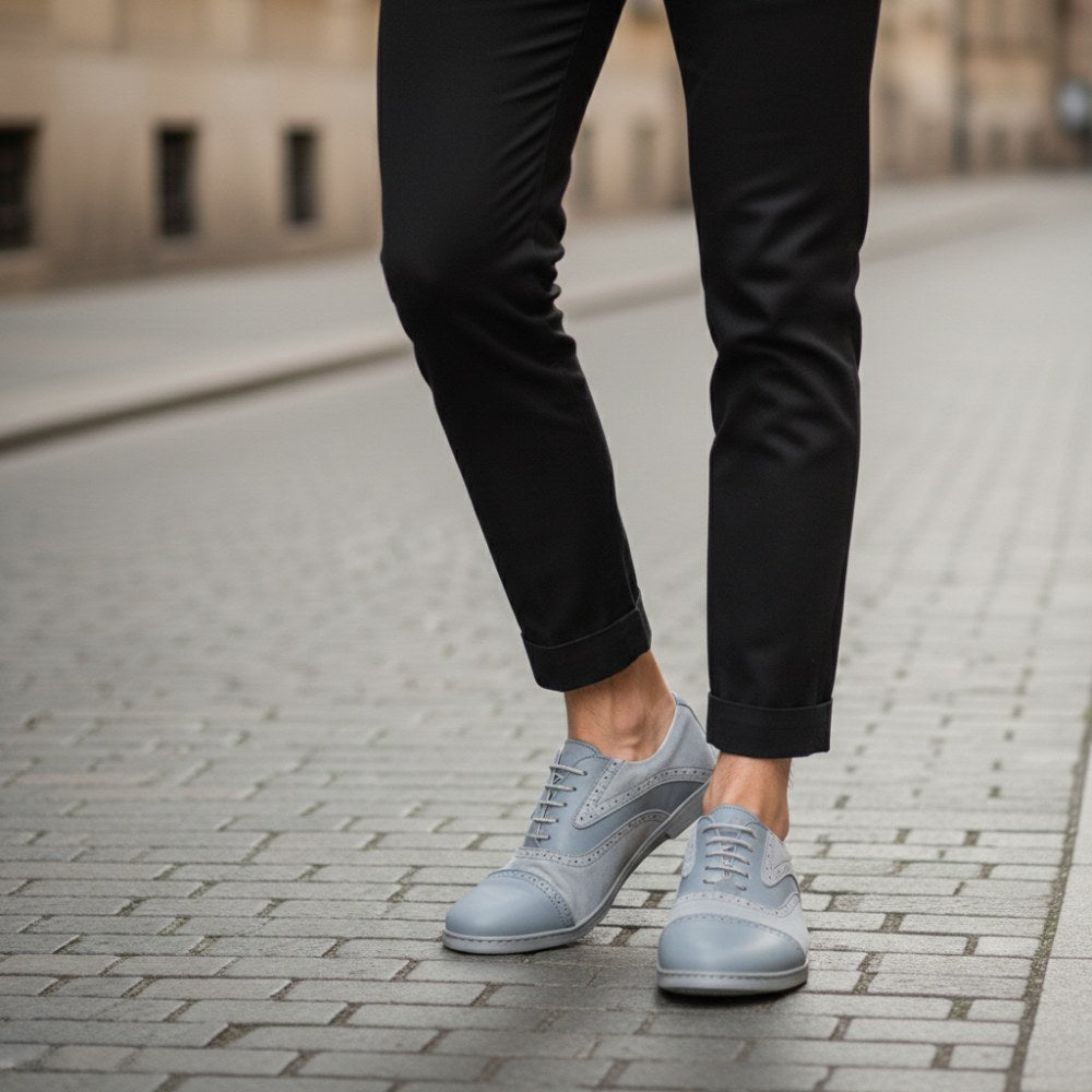 Dieser klassische Businessschuh ist zeitlos und passt hervorragend zum Anzug, lässt sich aber auch problemlos zur Jeans kombinieren, um mehr Eleganz in den Casual Look zu bringen. Für QENTLE verwenden wir hochwertiges Velours- und Nappaleder, welches durch die Linienführung und den rahmenden Broguings besonders nobel aussieht und den Barfußschuh optisch streckt.