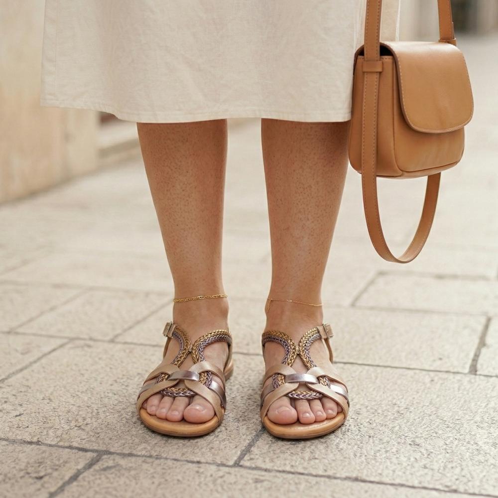 Die geflochtene Struktur aus Gold und Silber gibt unserem QEZ seinen edlen und besonders femininen Charakter. Mit dieser Barfußsandale peppst Du jedes Outfit auf und läufst megabequem durch den Sommer.