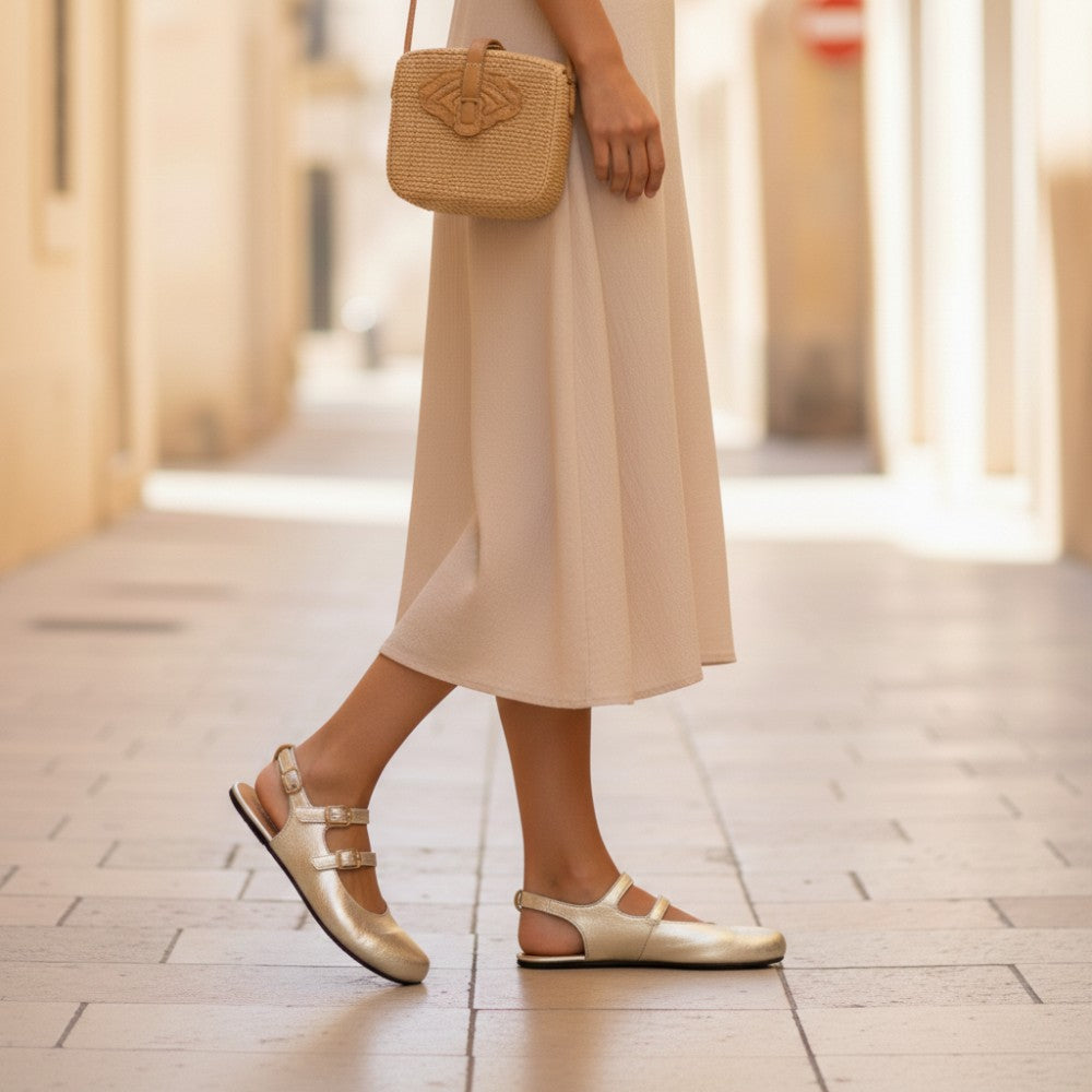 Unser QOMET Gold vereint Glamour und Komfort in einem offen geschnittenen Ballerinaschuh. Mit den verstellbaren Riemchen über dem Spann sowie dem zusätzlichen Riemchen hinten bietet unser QOMET Gold eine perfekte Passform und einen sicheren Halt bei jedem Schritt.